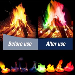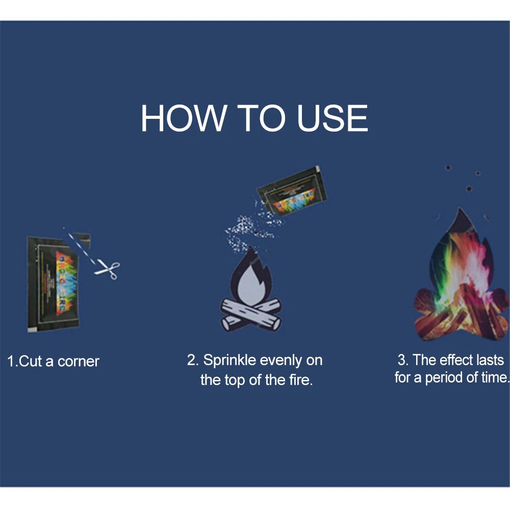 2. It is suitable for a campfire in the field, the fire of the fireplace and so on. The principle of the product makes the flame colorful by adding different elements.